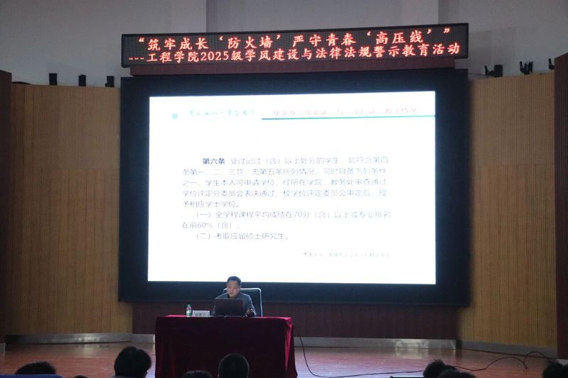 为强化 2025 级新生纪律意识与法治观念,扎实推进学院学风建设,1126日,学院开展2025级学风建设与法律法规警示讲座,讲座由学院党委副书记孙海宁主讲,2025级全体新生参会。